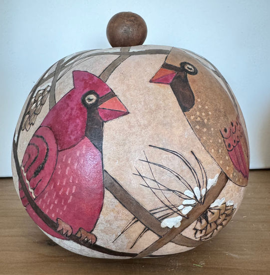 Gourds are an interesting art form, with endless possibilities. Grown on farms in California, the gourd is dried for a full year before I get my hands on it. Each gourd is treated as an individual project...as each gourd as it's own colorations and shape.